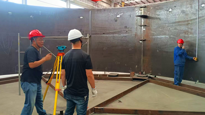 本次验收首节1#压力钢管,直径近10米。验收过程中验收组审核设备的材料材质文书、制造过程资料等,审核结果符合设计图纸,准予通过出厂验收。
